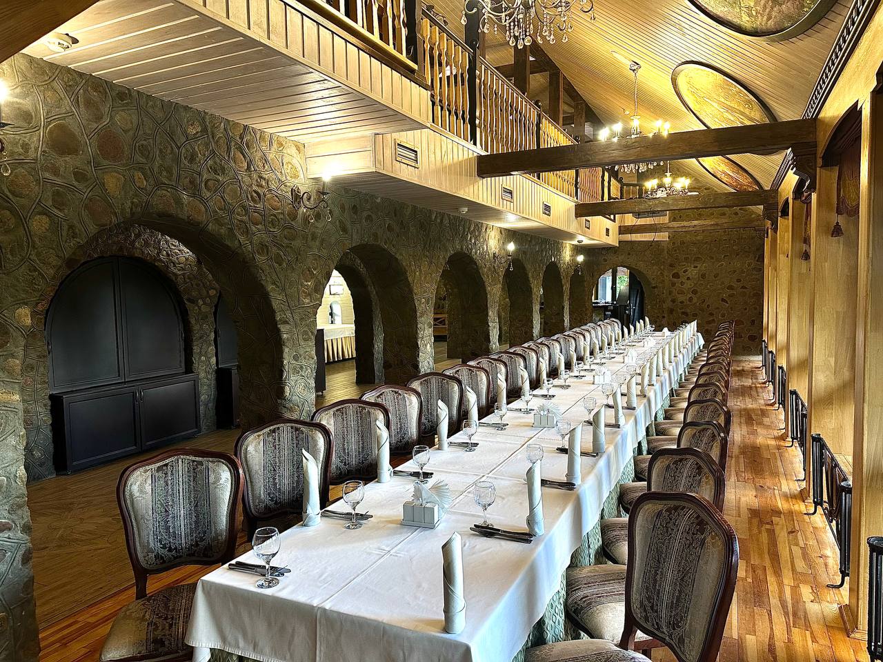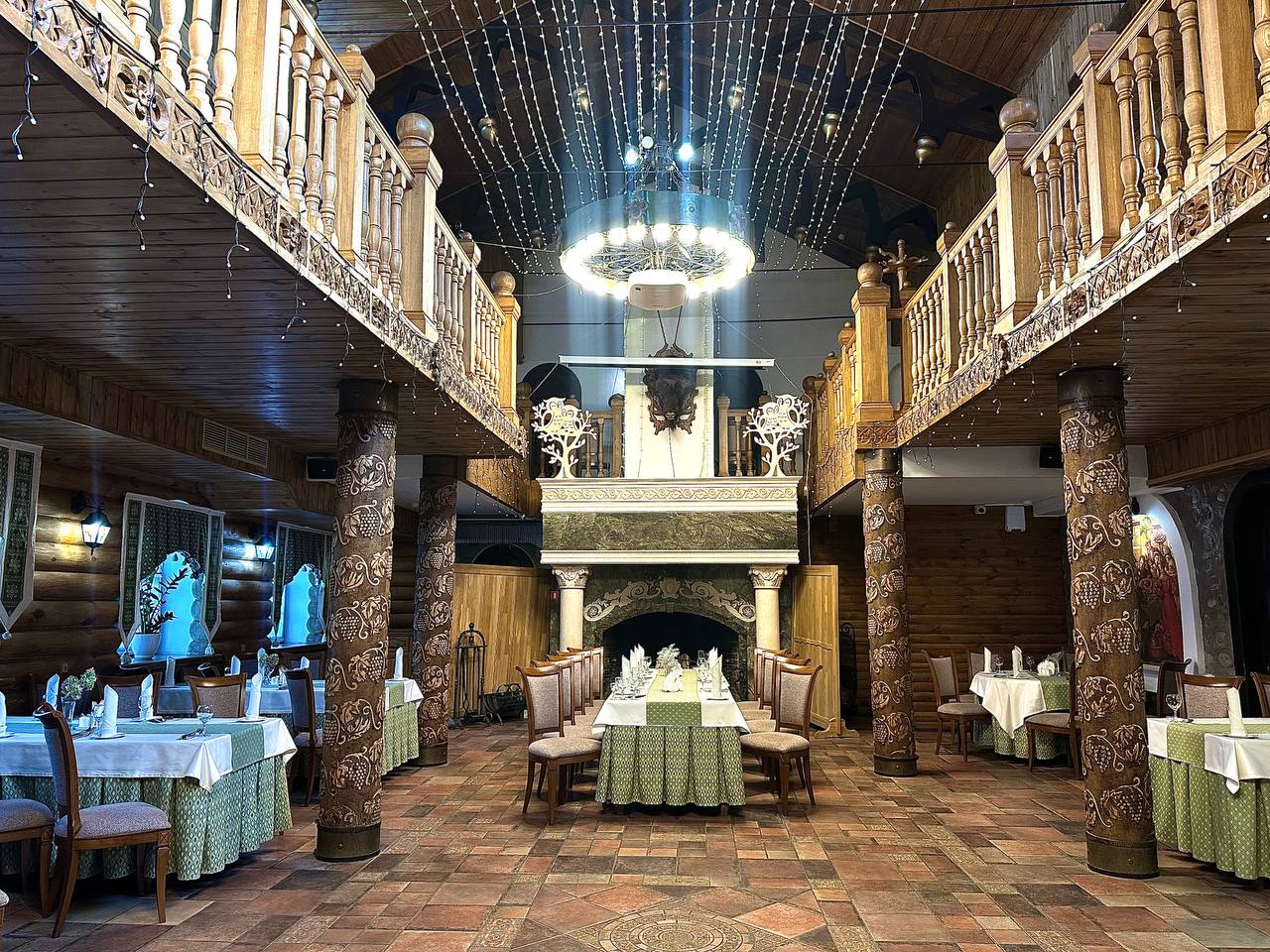 Первый зал выполнен «в дереве», а посреди него пылает огромный камин. Второй зал декорирован камнем и больше напоминает помещение замка, в центре которого бьет роскошный фонтан. Оба зала подойдут для организации масштабного фуршета, банкета или шведского стола.