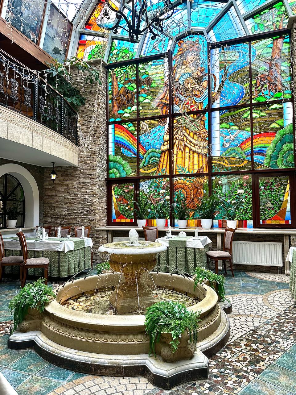 Зал напоминает о тех временах, когда было принято давать балы и приглашать внушительное количество гостей. Здесь все декорировано резным деревом и натуральным камнем.